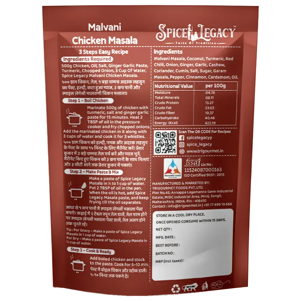 Bring the real coastal taste of Malvan to your kitchen with Spice Legacy Malvani Chicken Masala. This ready-to-cook mix is made from pure spices using Grandma’s authentic recipe. With zero adulteration, you get that perfect, home-style Malvani flavour in every bite!