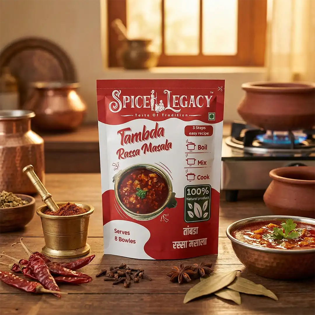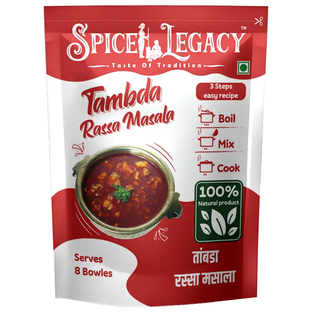 Enjoy the famous spicy red curry of Maharashtra with Spice Legacy Tambda Rassa Masala Mix. Made with Grandma’s authentic recipe and 100% pure spices, this ready-to-cook masala gives you that perfect home-cooked taste. With zero adulteration—just open the pack, cook, and enjoy!